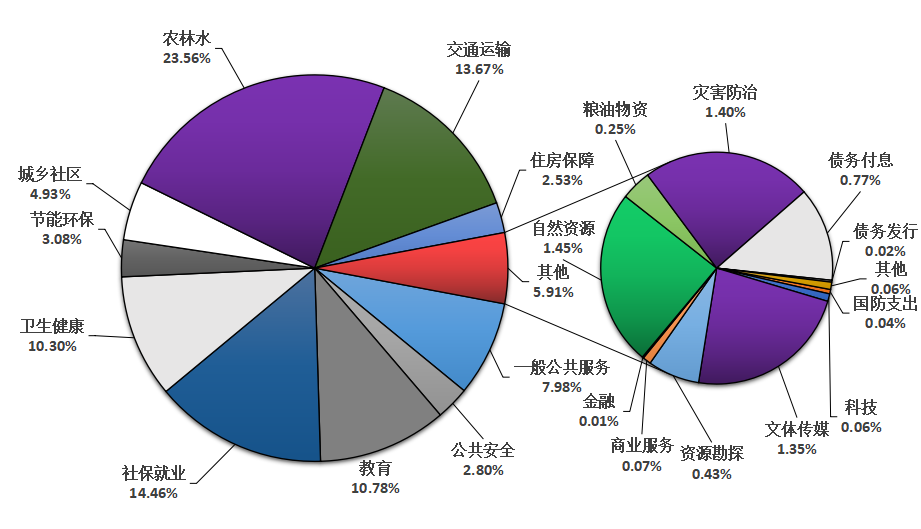 2021年全县一般公共预算支出123293万元。其中:一般公共服务支出13816万元;国防支出62万元;公共安全支出3411万元;教育支出17120万元,主要安排改善高中办学条件、学前教育发展、中小学生课后服务经费、城乡义务教育两免一补资金、信息化建设、教辅资料等;科学技术支出225万元;文化旅游体育与传媒支出2418万元;社会保障和就业支出23366万元,主要安排城乡居民人身意外保险、城乡居民补充养老保险、企业养老保险缺口补助、对机关事业养老保险补助、就业资金等;卫生健康支出13860万元,主要安排公立医院改革补助、新型冠状病毒肺炎防控、基本公卫补助、城乡居民医保补助等;节能环保支出2259万元;城乡社区支出2050万元;农林水支出25437万元,主要安排农田建设、农业生产发展、脱贫成果巩固、乡村振兴、林业水利发展资金等;交通运输支出4267万元;资源勘探信息等支出484万元;商业服务业等支出624万元;金融支出42万元;自然资源海洋气象等支出802万元;住房保障支出3091万元;粮油物资储备支出240万元;灾害防治及应急管理支出1812万元;预备费2017万元;债务付息支出1812万元;其他支出4078万元。